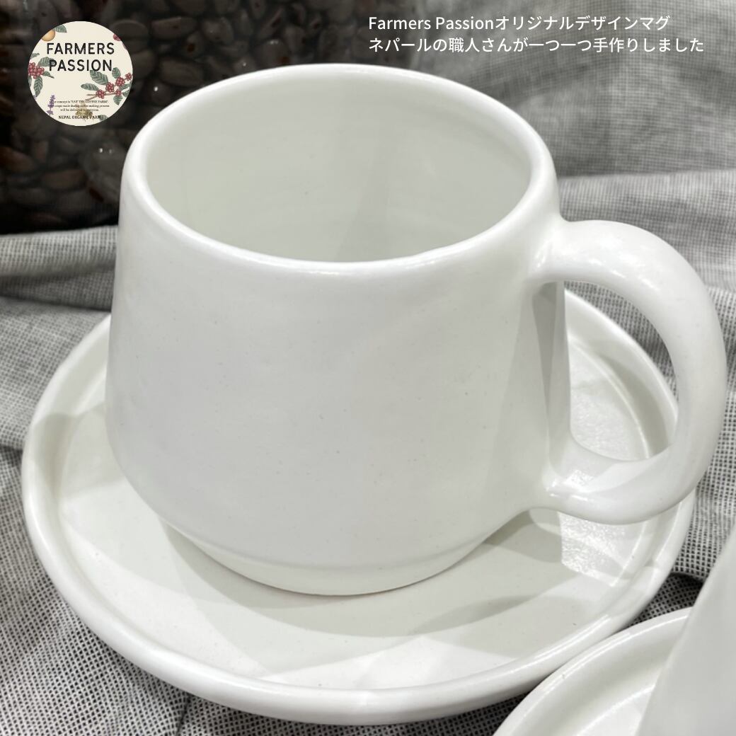 ネパールの職人さんが手作りしたFarmersPassionオリジナルのマグカップとソーサーのセットです。コーヒーが冷めにくいデザインとぬくもりのある風合いにこだわりました。ソーサーは、小皿としてもお使いいただけます。
