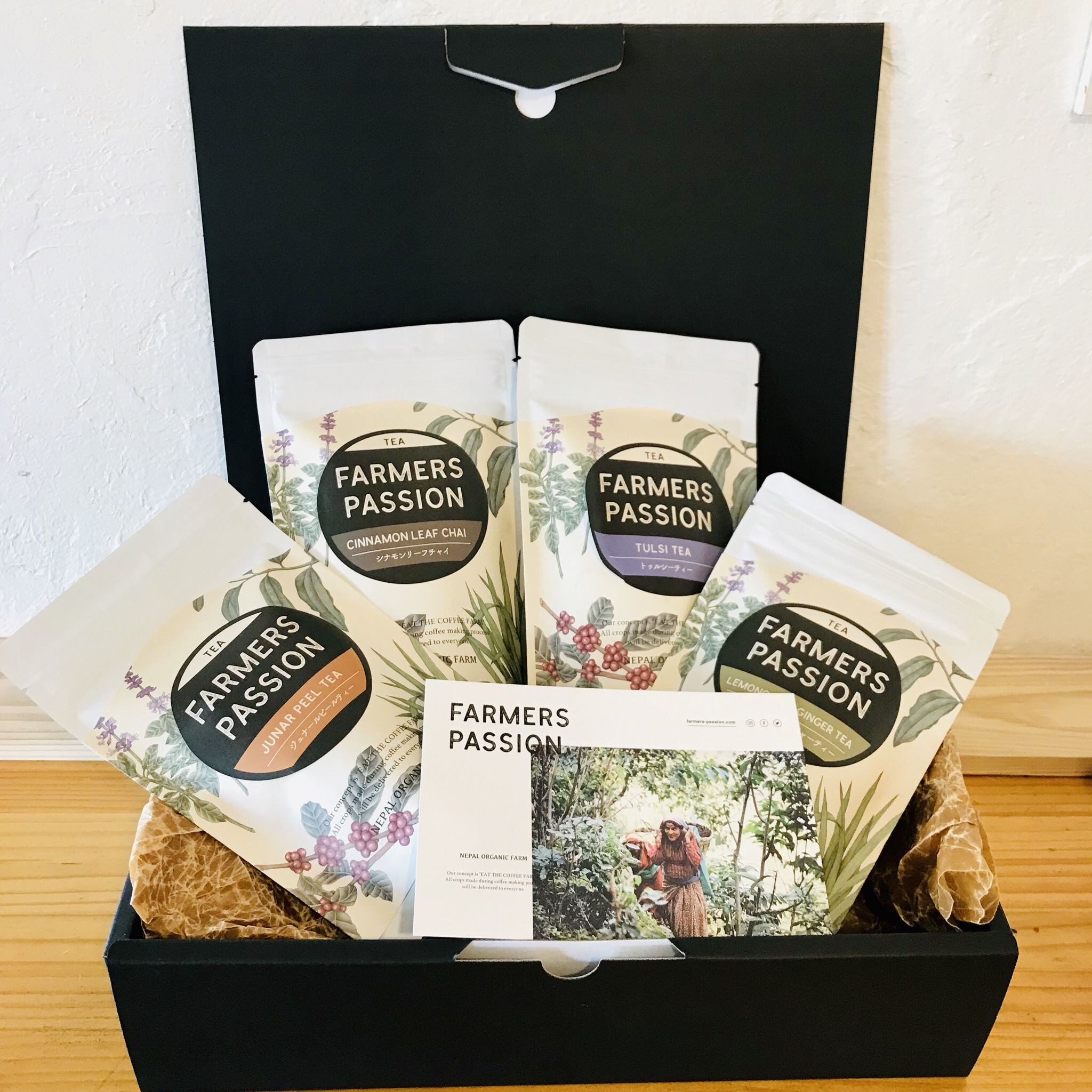 ネパールの直営農園でオーガニック栽培したハーブだけでつくったハーブティーのティーパックの詰め合わせです。レモングラスジンジャーティー、トゥルシーティー、ジュナールピールティー、シナモンリーフチャイの4種をお楽しみいただけます。お好きなポストカードをおひとつお選び下さい。