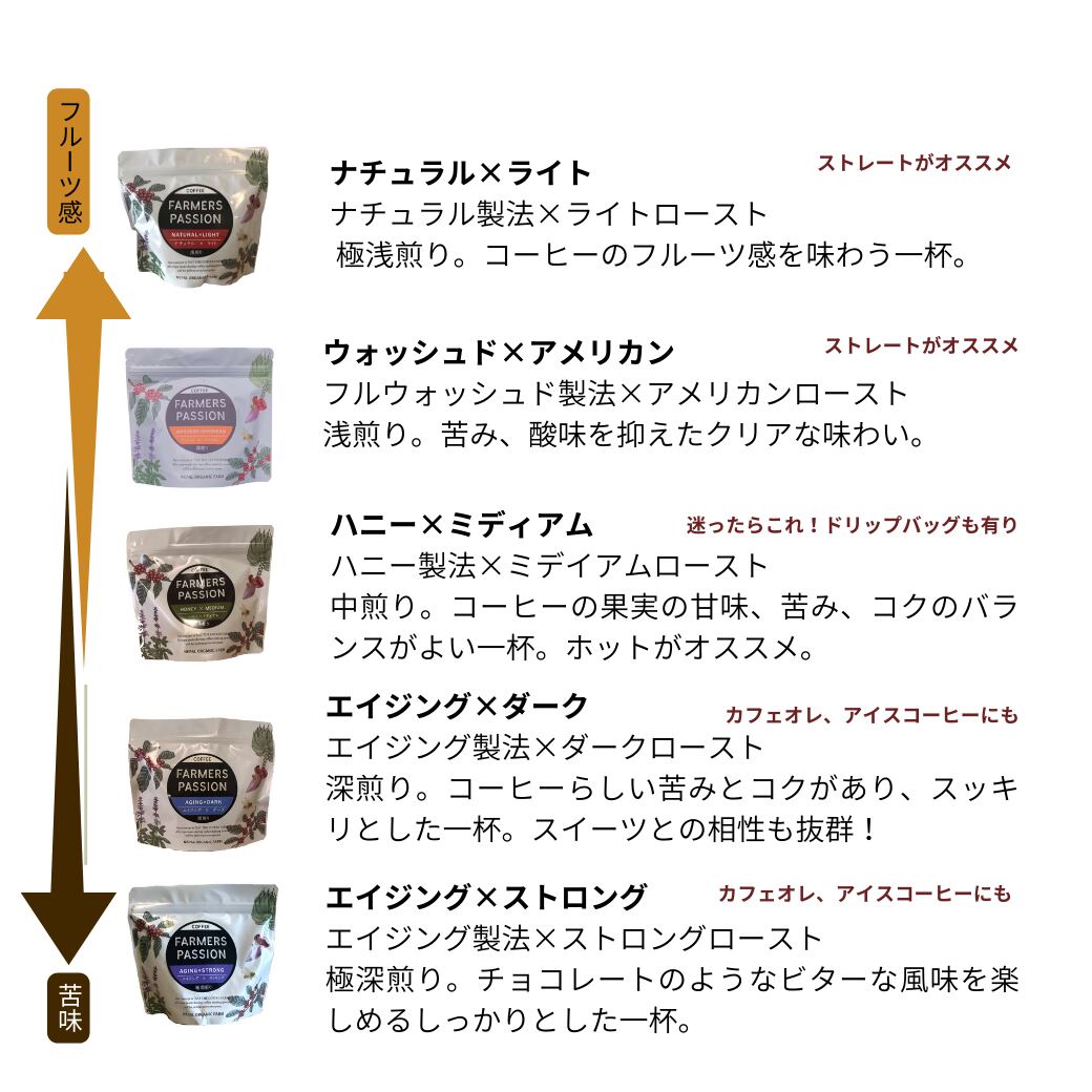 ナチュラル×ライト ( 浅煎り )、ハニー×ミディアム ( 中煎り )、 エイジング×ダーク ( 深煎り ) の3種の珈琲豆を各200gずつ詰め合わせたギフトです。ネパールの直営農園でオーガニック栽培し、自家焙煎した珈琲豆の奥深さをとことん味わえます。